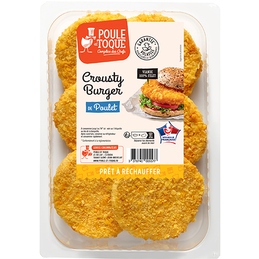 Burger de filet de poulet crousty 120 g barquette 720 g sous atmosphère poule et toque